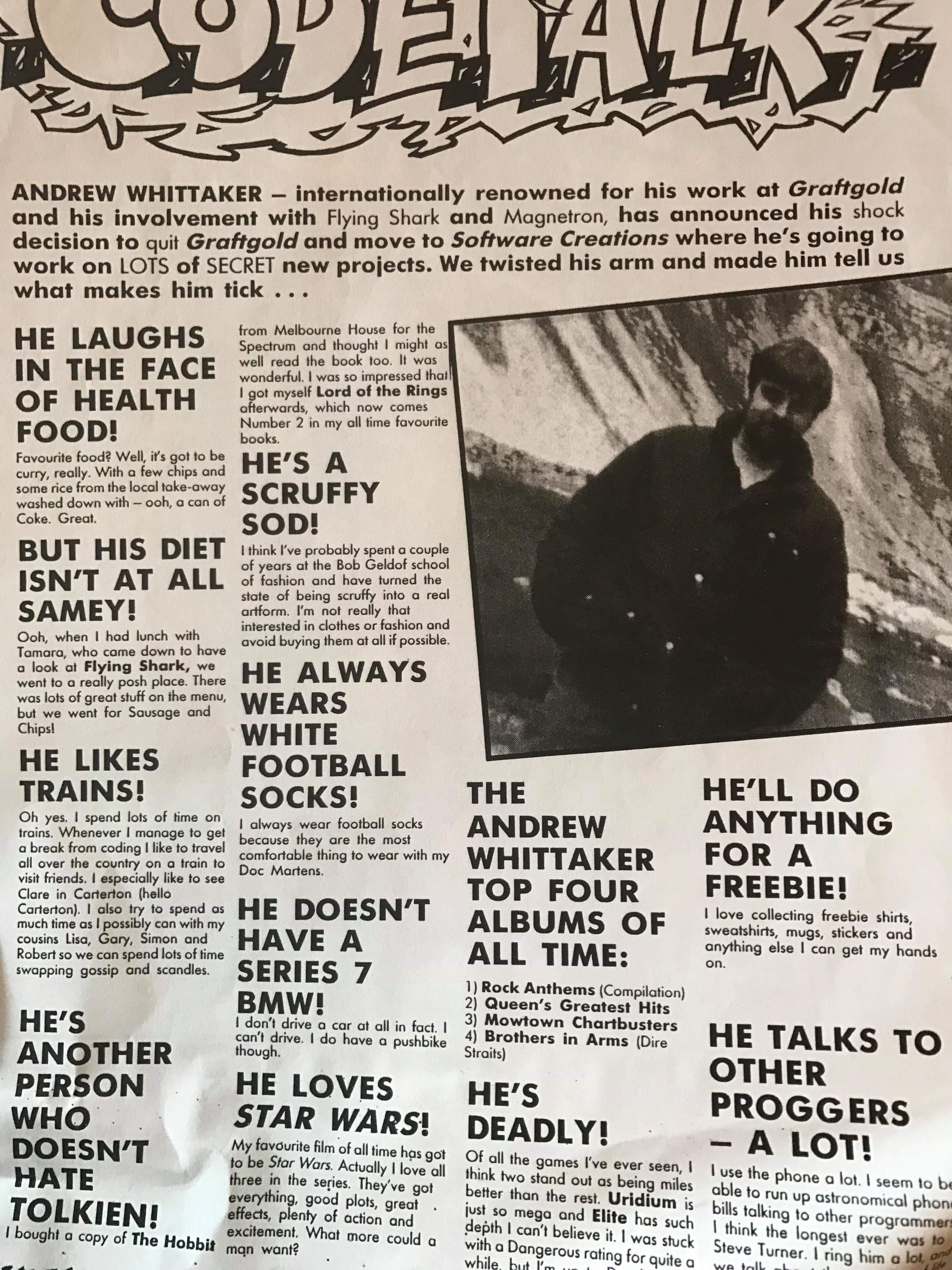 Despite his aversion to interviews, Jane ended up getting in to an interview for Sinclair User magazine. You can see both Flying Shark and Magnetron mentioned in the header as they were the hot games of the day. You may find this interview rather tongue in cheek and there is a story right there! Jane, still in his teens, was given a formal set of questions to answer in a telephone interview with the magazine. The magazine arrived in the stores and Jane was so proud to see it in his local railway station. However when Jane looked at the interview, lo and behold it had been hijacked, by his colleagues and their sense of fun: