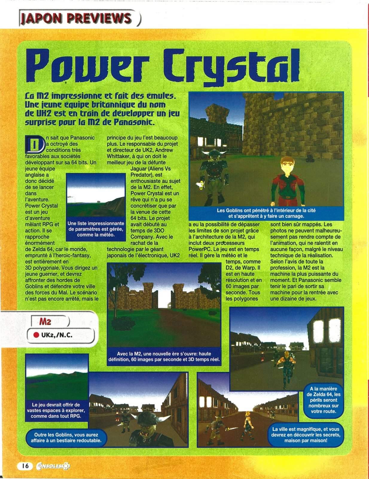 As Edge Magazine stated, Power Crystal “shone on the M2”, with an enormous explorable world, fully realised in 3D, along with hundreds of characters and quests Despite the console never being released, many magazine journalists, developers and members of the public had the opportunity to play this ground breaking game hands-on. Such is the mythos of Power Crystal it is still discussed eagerly today by fans of console gaming.