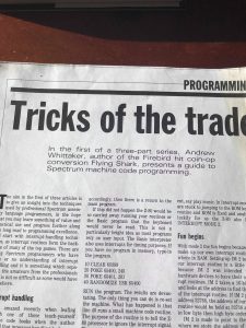 At the time of release of Flying Shark and Magnetron Jane was also asked to do his fair share of interviews and magazine features. In the Tricks Of The Trade article Jane was asked to write a machine code programming tutorial. Certainly something you don't see these days. Whittaker wrote about the famous "interrupt mode 2" of the Z80 chip in the Spectrum computer, which allowed software to run in the background with the impression of multi tasking with other software - long before the advent of Windows etc.